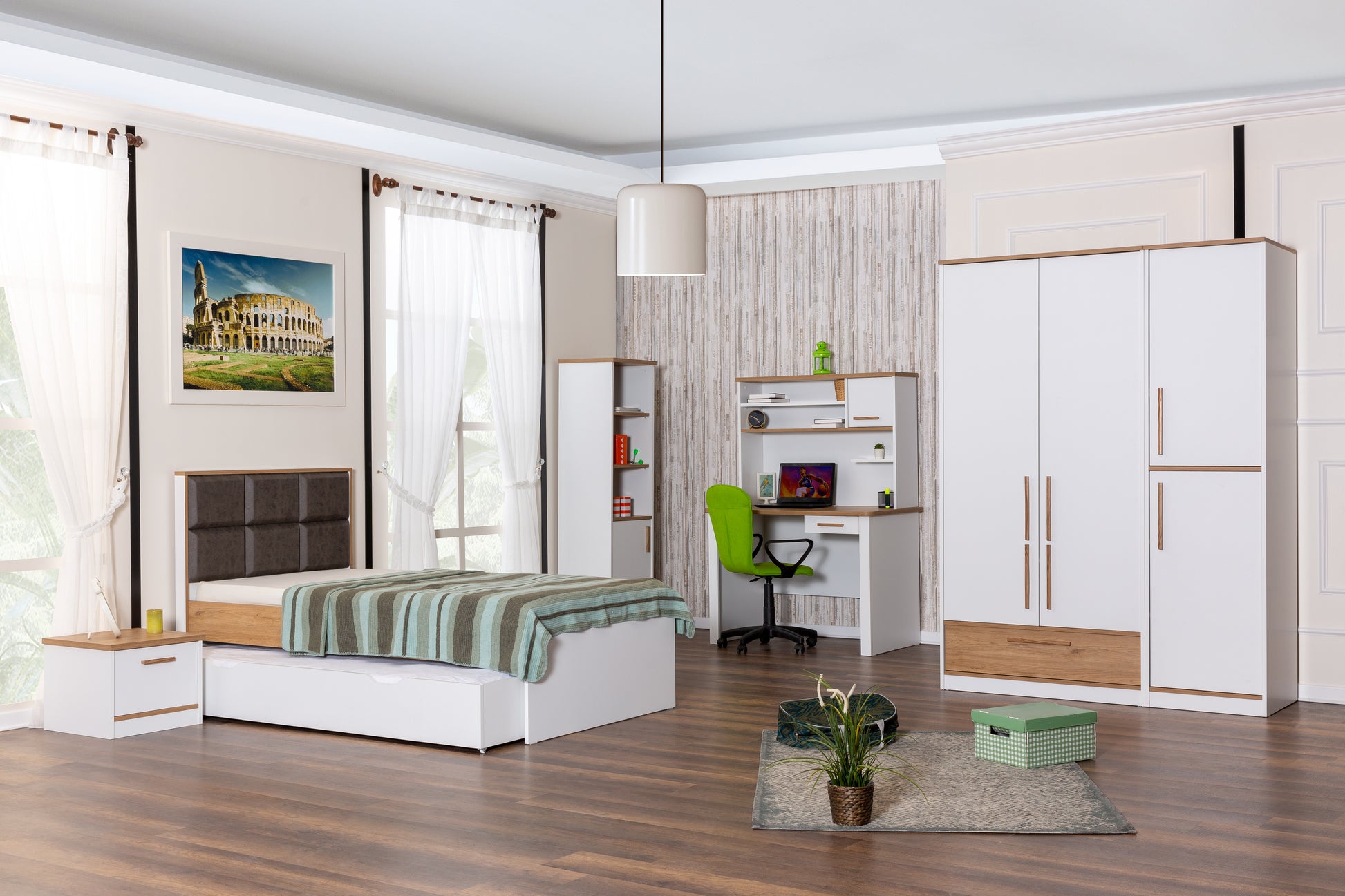 Genç Odası Takımı, çocuğunuzun dinlenme, oyun ve öğrenme alanını daha güvenli, düzenli ve eğlenceli hale getiren, onun kişiliğini yansıtan özel bir tasarımdır.
